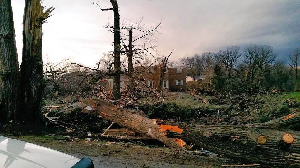 But his family wasn’t at home when it hit. “My family was on the way to Louisville, dog was in the basement and she survived.”